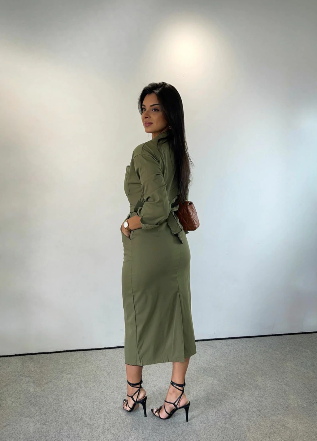 Destaque para a fenda nas costas que adiciona charme e sensualidade na medida certa e fechamento em botões forrados, modelagem, midi alongado além do cinto com amarração que acompanha a peça e valoriza a cintura. Os detalhes em costura nos bolsos frontais, cinto e barra completam o visual com requinte,