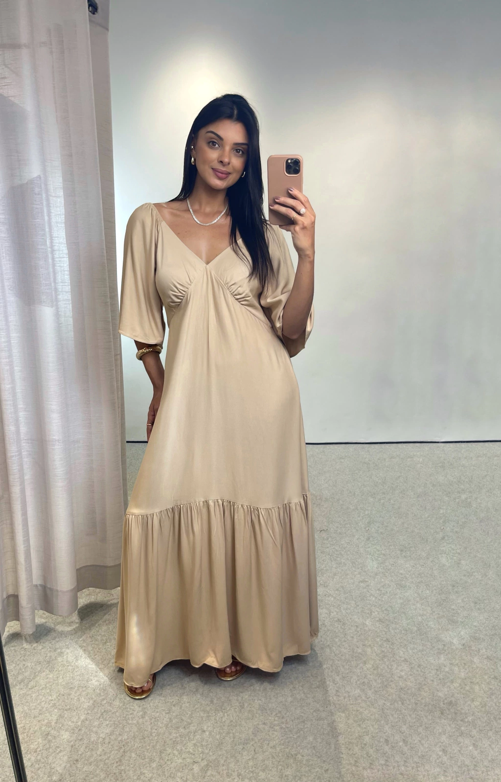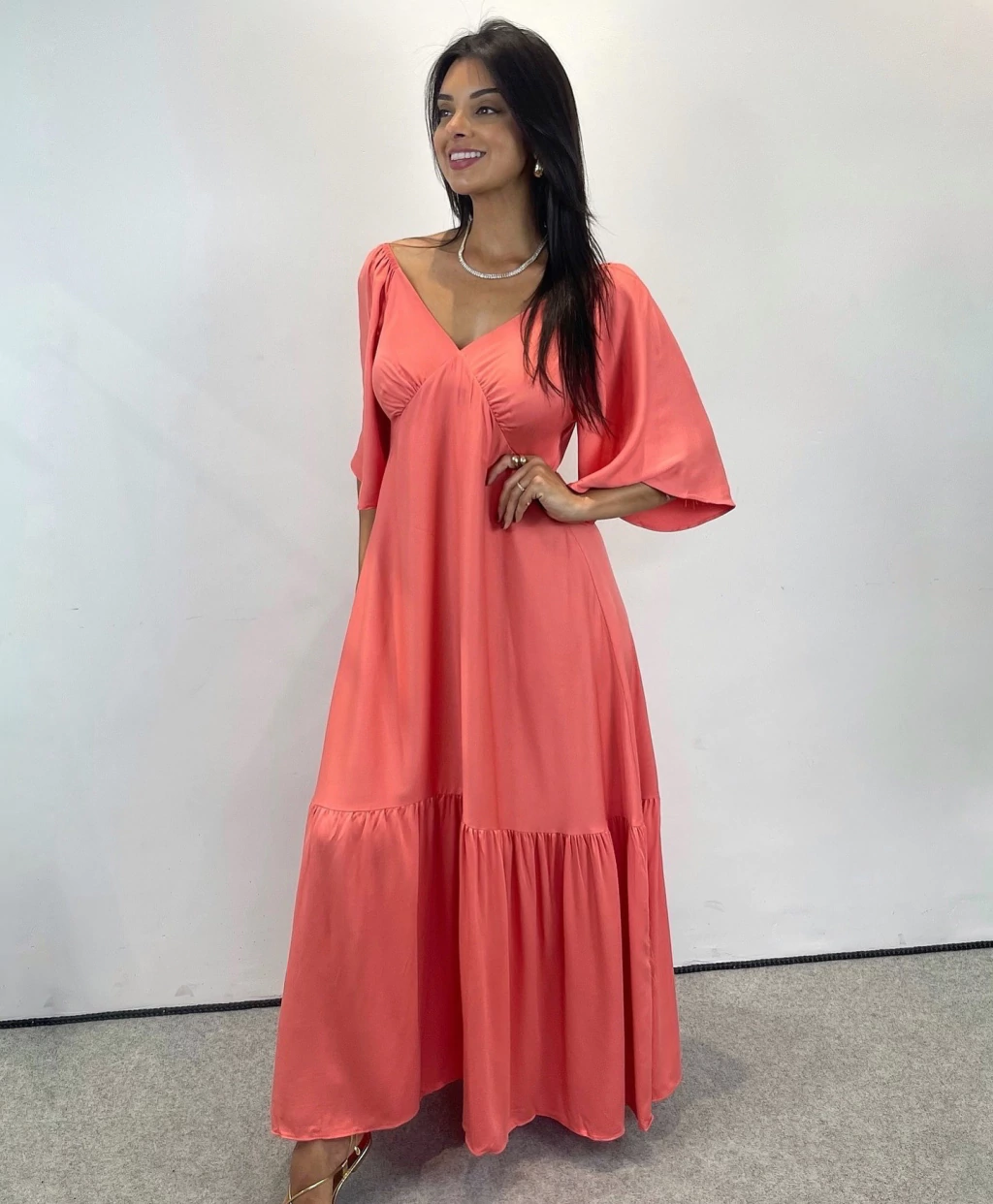 O detalhe em drapeado ao longo do comprimento adiciona um toque de requinte e leveza, fazendo deste vestido uma escolha versátil para ocasiões especiais, dias quentes ou até mesmo um passeio na praia. Perfeito para quem busca um look leve e elegante sem esforço.